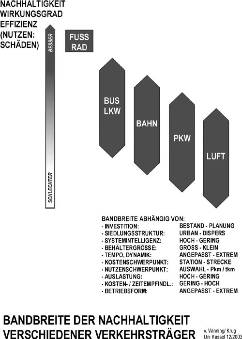 (Abb.1: „Bandbreiten der Nachhaltigkeit verschiedener Verkehrsträger“)