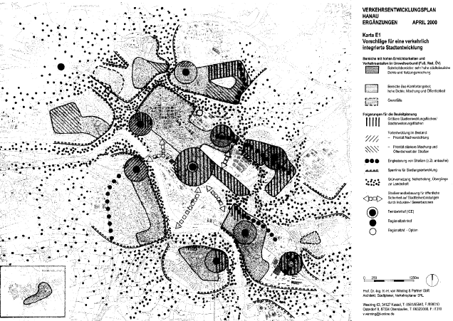 Der zweite Integrationsmassstab, der zwingend notwendig erscheint, ist die Integration des Verkehrsmittels Siedlungsstruktur auf kommunaler und regionaler Ebene. Wir müssen be-greifen, dass die Siedlungsstruktur mit Abstand das wirkungsvollste Verkehrsmittel, nämlich zur Steigerung der Naherreichbarkeit und des öffentlichen Verkehrs ist, und zwar in dem dramatischem Umfang der Effizienzfaktoren von 25 bis 50 aus der Abb.2. Schon geringste Koordinationen von Verkehr und Siedlungsstruktur bewirken mehr Erreichbarkeit als die teu-ren Einzelmaßnahmen im Verkehrsbereich. Ein kommunales Beispiel findet sich in Abb.3,